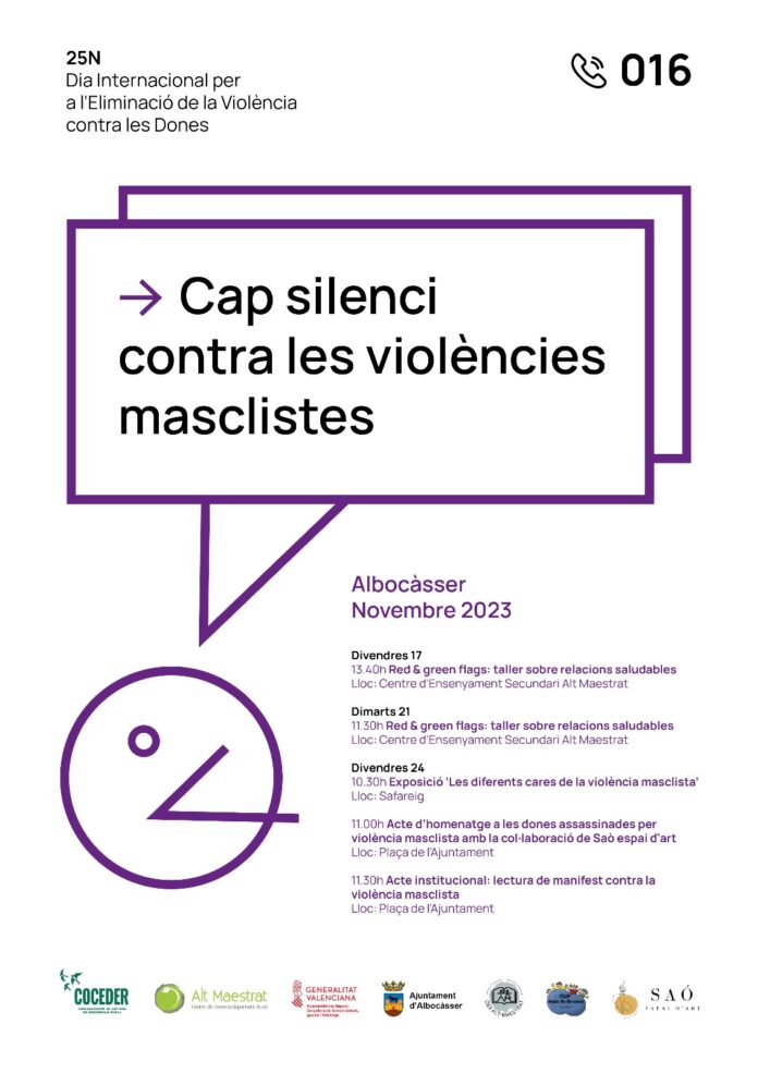 El dissabte 25 a les 17.30h s’iniciarà la commemoració d’aquest dia amb la lectura del manifest institucional per part de l’alcaldessa Silvia Colom Monferrer, seguida de la lectura de la representant del Grup Punt Violeta, Inés García-Martín Folch i la invitació a participar dels actes d’aquest dia per part de la regidora d’Igualtat, Losar Tena Vicente. “Cal lluitar i conscienciar contra el masclisme cada dia de l’any. El 25N, pel seu simbolisme, és una gran ocasió per focalitzar i condemnar totes les actituds i conductes masclistes per tal d’erradicar-les definitivament de la nostra societat”, ha expressat Colom.