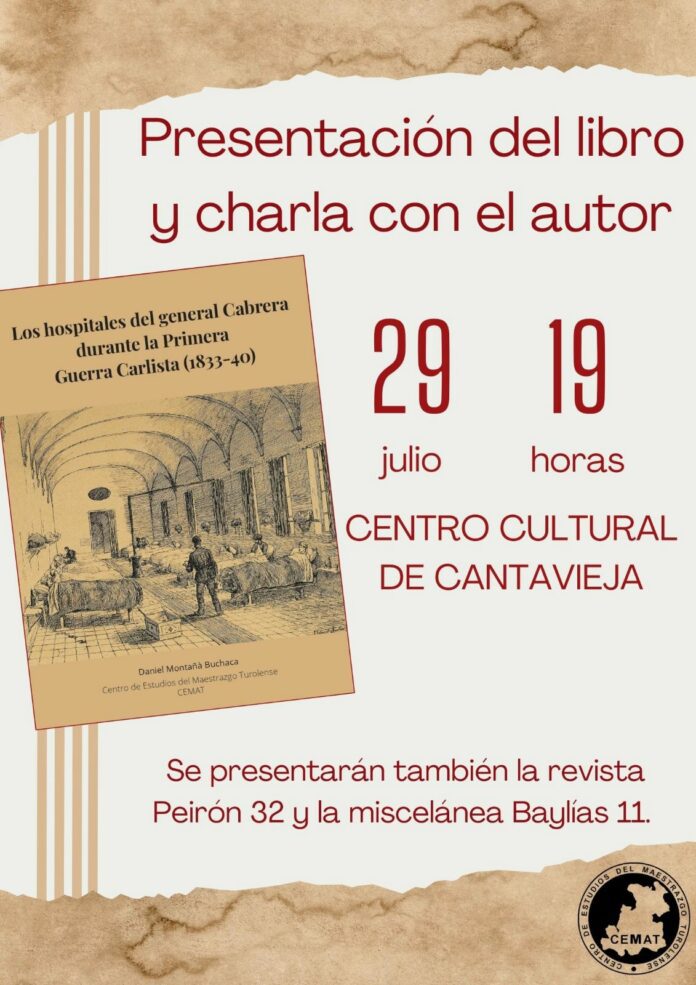 📚 El 29 de julio, en el Centro Cultural de Cantavieja, el Centro de Estudios del Maestrazgo presenta “Los hospitales del general Cabrera durante la primera Guerra Carlista (1833-40)” de David Montañà Buchaca.