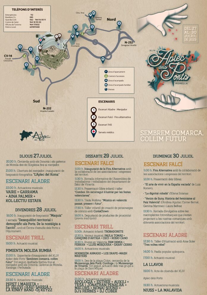 L’Aplec dels Ports arranca a Morella esta nit amb els primers concerts. Esta 44a edició compta amb una gran quantitat d’actes, els quals ajunten la reivindicació i la festa per a situar al mapa una comarca oblidada per les institucions. Cercaviles, xerrades, presentacions de llibres, tallers, la fira alternativa i les actuacions musicals omplin l’agenda dels quatre dies de trobada comarcal des d’avui fins al diumenge 30 de juliol. Una completa programació apta per a tots els públics.