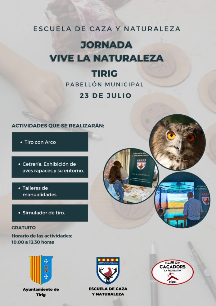 L’Ajuntament de Tírig, la Escuela de Caza y Naturaleza i el Club de Caçadors ‘La Recreativa’ ha organitzat una completa jornada d’activitats per a diumenge que ve 23 de juliol. De 10h a 13.30h, grans i xicotets podran participar en sessions de tir amb arc, falconeria amb una exhibició d’aus rapaces i el seu entorn, un taller de manualitats i un simulador de tir. Totes les activitats, de caràcter gratuït, seran en el pavelló municipal.