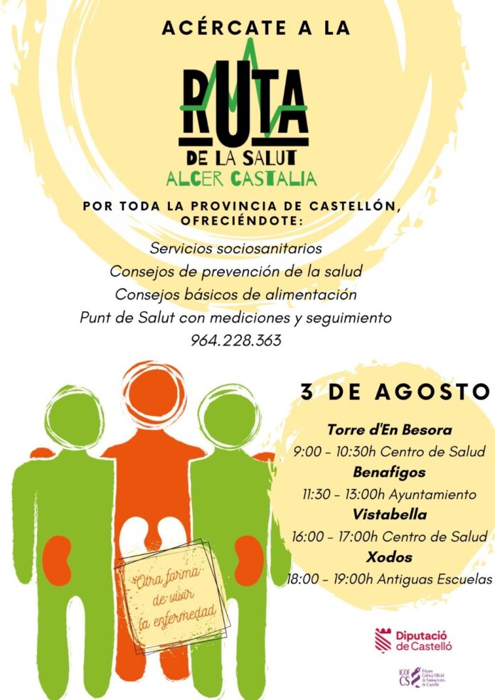 Durant la vesprada d’ahir, el personal d’Alcer Castalia (Associació de Persones amb Malaltia Renal i Trasplantades de la Província de Castelló) va estar a Ares del Maestrat oferint a tota la població interessada diferents dades i consells sobre els serveis sociosanitaris que ofereixen, prevenció enfront de les malalties renals o l’alimentació saludable; així com van instal·lar un punt de salut amb mesuraments i seguiment. La iniciativa s’inclou dins de la Ruta de la Salut d’Alcer Castalia.