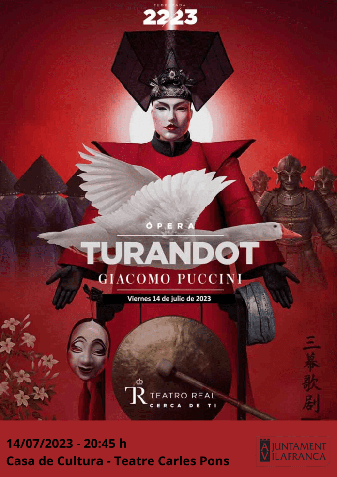 Més de 20.000 persones han pogut gaudir de la projecció de l’òpera Turandot arreu de tota la geografia espanyola. Auditoris, museus i places s’han omplert amb aquesta representació, i entre aquests està la Casa de la Cultura de Vilafranca. L’òpera de Giacomo Puccini ha estat projectada a la Sala Carles Pons de Vilafranca aquest divendres 14 de juliol, sent, juntament amb Castelló, l’únic municipi de la província on s’ha retransmés.