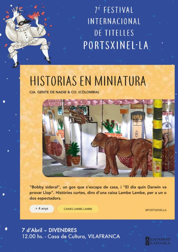 Dimecres 5 -Taller de titelles de paper, per Taller Hermanos Castro (Colòmbia). CRA Els Ports, de Forcall. -Cercavila, per LAPinzón (Castelló). Comarca dels Ports. 12.00. Dijous 6 -Cercavila, per LAPinzón (Castelló). Comarca dels Ports. 12.00. -‘Historias en miniatura’, per Gente de Nadie & Co. (Colòmbia). Plaça de l’Ajuntament, de Palanques. 18.00. -Trobada Titellaire. Alberg Roca Parda, de Cinctorres. 22.00. Divendres 7: -Taller de construcció de caixes Lambe-Lambe, per Taller HermanosCastro (Colòmbia). Casa de Cultura, de Vilafranca. 12.00. -‘El libro de aventuras’, per Tirita Teatro (Castella-la Manxa). Plaça de l’Ajuntament, de Portell de Morella. 12.00. -‘Los títeres de Caperucita Roja’, per A la Sombrita (Andalusia). Plaça, d’Herbers. 12.00. -‘Historias en miniatura’, per Gente de Nadie & Co (Colòmbia). Plaça Casa de Cultura, de Vilafranca. 17.00. -‘Historias de Reyes’, de La Mar Esperanza (Cuba). Plaça de l’Ajuntament, de Palanques. 17.30. -‘1 planeta & 4 maos’, de Varazim Teatre (Portugal). Convent d’en Blai Berga, de Forcall. 19.00. Dissabte 8: