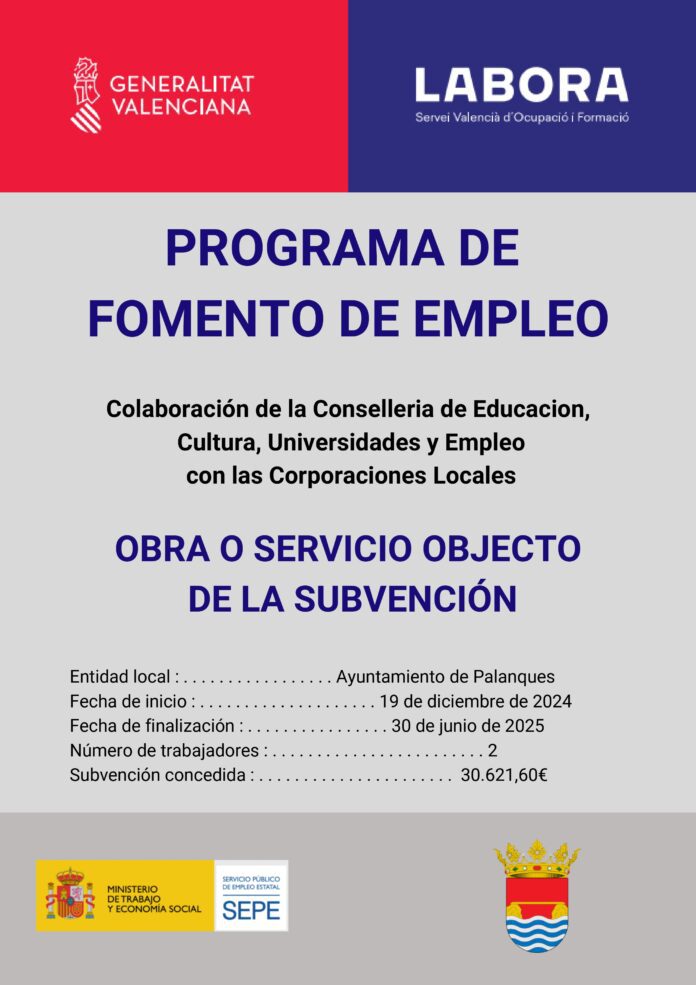 L’Ajuntament de Palanques ha contractat dues persones dins del programa EMCORP. Es tracta de contractes de sis mesos i 13 dies, fins al pròxim 30 de juny. Un auxiliar administratiu prestarà tasques de suport a la labor diària del consistori i un peó s’encarregarà de l’àrea de neteja i obres. La contractació s’ha realitzat dins del Programa de Foment de l’Ocupació, amb la col·laboració de la Conselleria d’Educació, Cultura, Universitats i Ocupació i el Servei Públic d’Ocupació Estatal, SEPE. La subvenció que percebrà el municipi serà de 30.621.60€