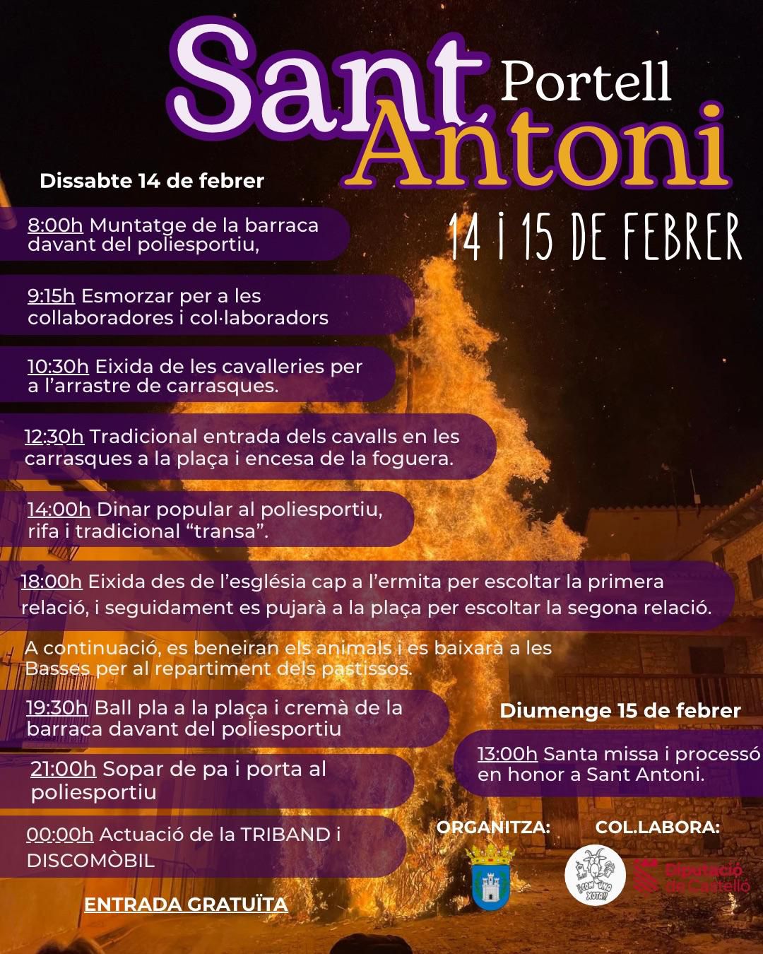 La celebració començarà el dissabte 14 de febrer amb el muntatge de la barraca davant del poliesportiu i un esmorzar per a col·laboradores i col·laboradors. Al llarg del matí tindrà lloc l’eixida de les cavalleries per a l’arrastre de carrasques, així com la tradicional entrada dels cavalls a la plaça i l’encesa de la foguera, un dels moments més emblemàtics de la festa.