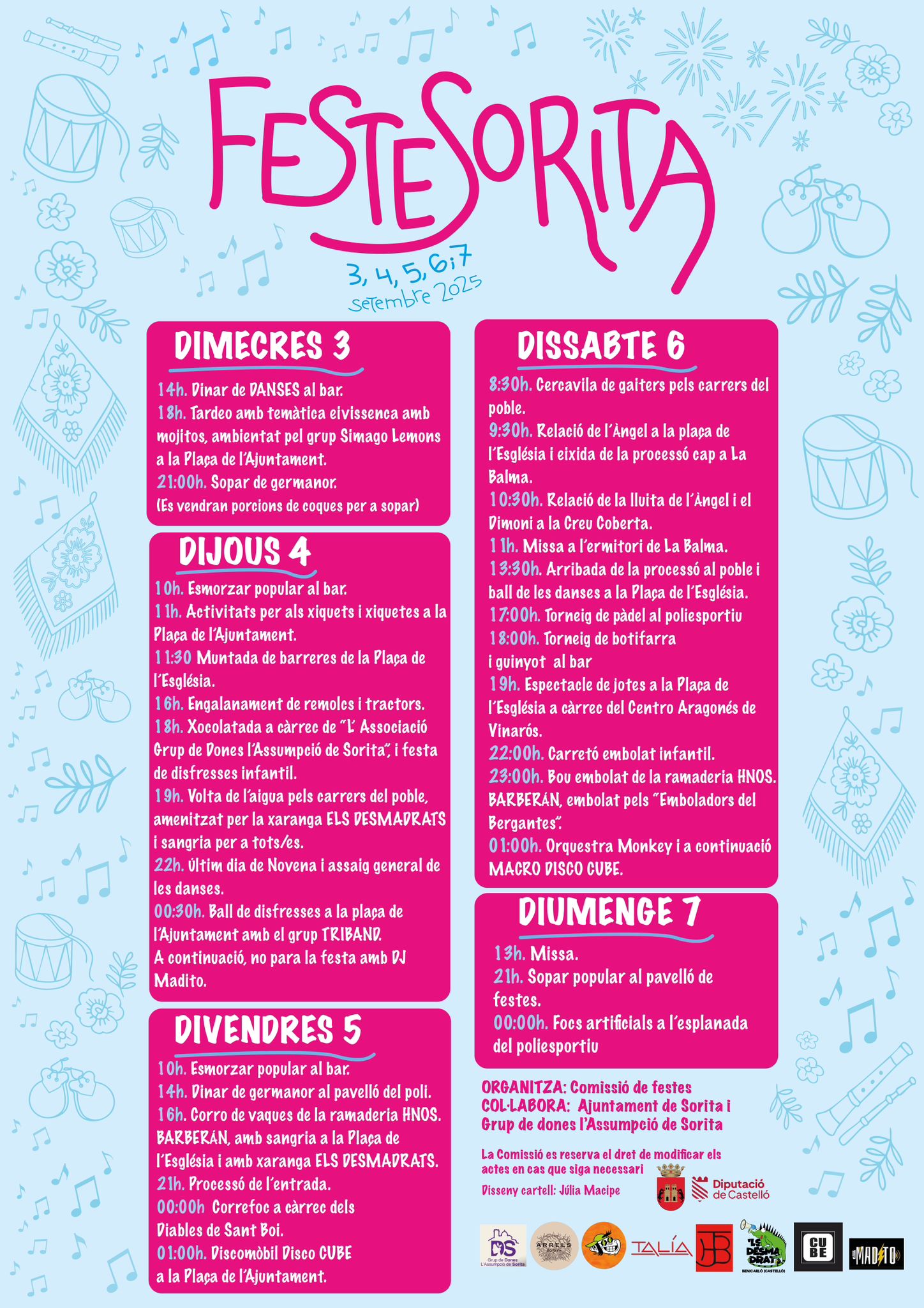 Sorita celebra hui, divendres 5 de setembre, l’equador de les seues festes patronals amb una jornada plena d’activitats per a tots els públics. Després de l’esmorzar popular i el dinar de germanor al pavelló, la vesprada està marcada pels bous de la ramaderia Hnos. Barberán, amb l’animació de la xaranga Els Desmadrats i la tradicional entrada de bous.