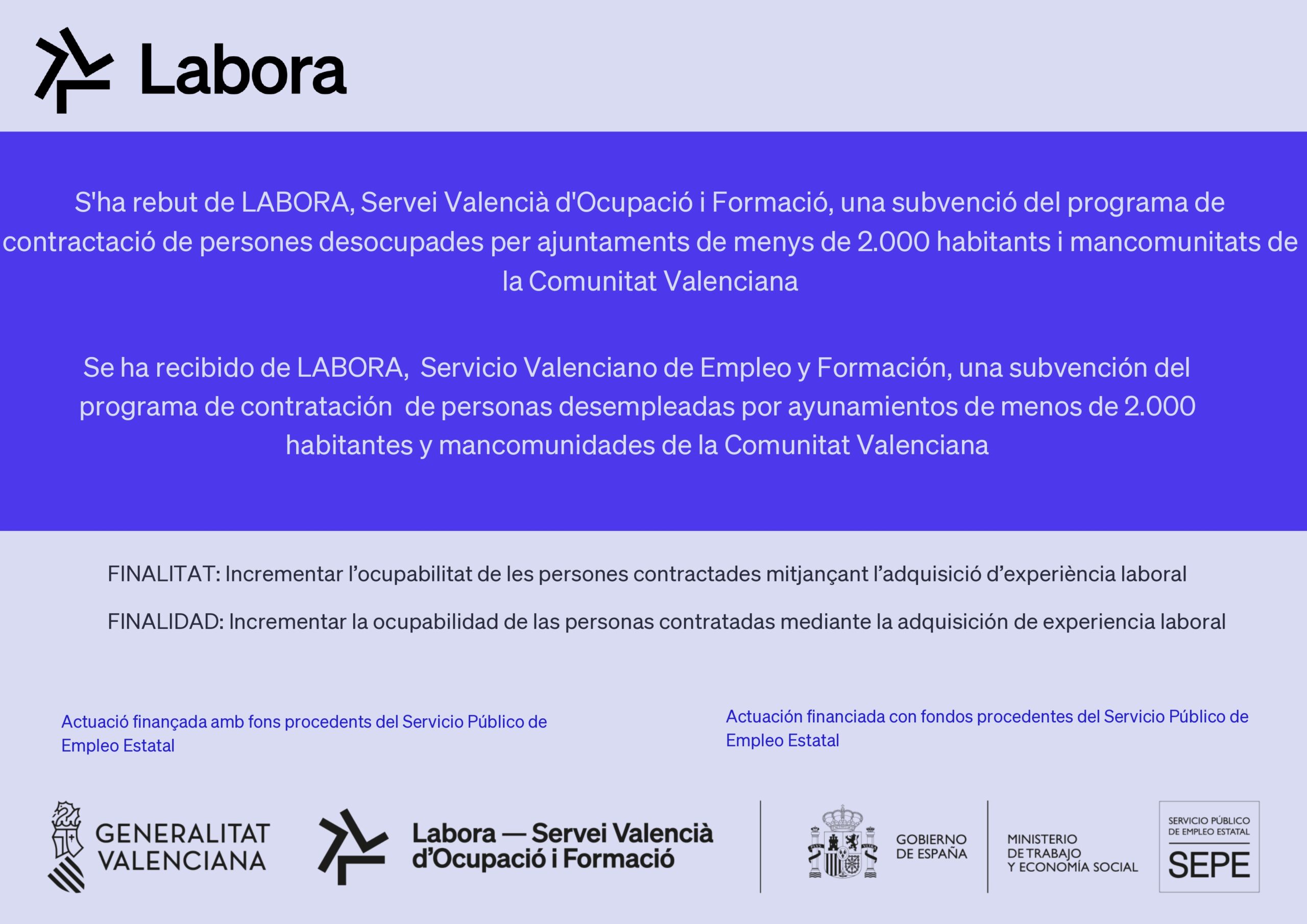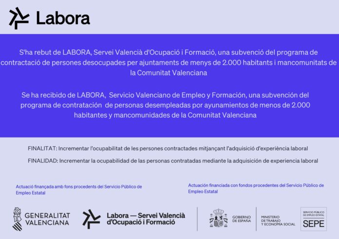 L’Ajuntament de Sorita continua apostant per l’ocupació local amb la posada en marxa del programa EMCORP de LABORA – Servei Valencià d’Ocupació i Formació-, destinat a municipis de menys de 2.000 habitants i mancomunitats de la Comunitat Valenciana.