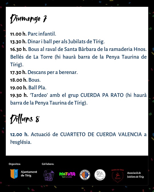 El programa inclou propostes familiars com el parc infantil i el dinar i ball dels jubilats, a més de dues sessions de ball pla i l’actuació de Batucada Matuta, dissabte per la vesprada. Les festes es tancaran el dilluns 8 de desembre amb una actuació especial del Cuarteto de Cuerda Valencia a l’església, que posarà el colofó musical a quatre dies de festa.