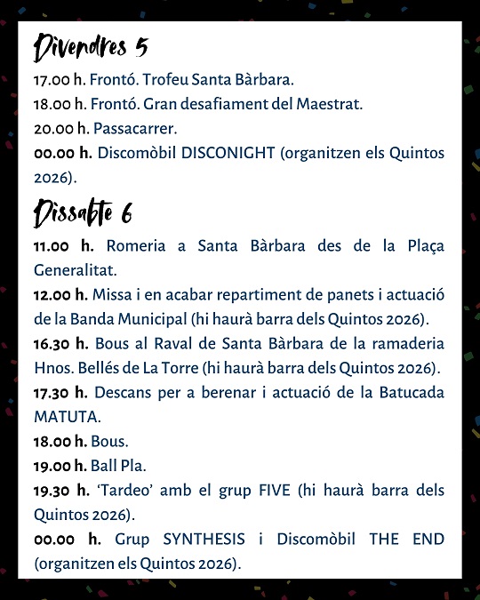 També hi haurà espai per a la música i el ball amb les actuacions dels grups Five, Synthesis i Cuerda pa Rato, així com les sessions de discomòbil Disconight i The End, organitzades pels Quintos 2026, que al llarg de tot el cap de setmana dinamitzaran les festes amb diverses barres.