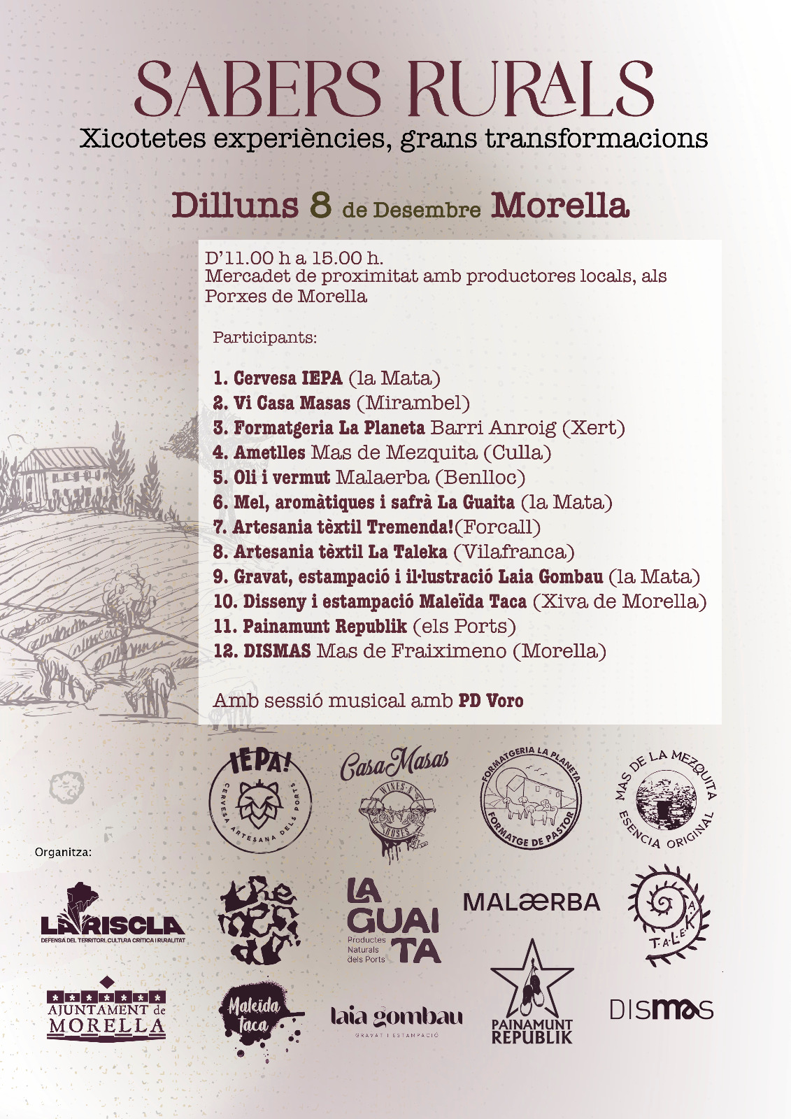 El dilluns 8 de desembre es celebrarà a Morella la segona edició del mercat de productores locals “Sabers Rurals”, que organitza l’associació La Riscla amb la col·laboració de l’ajuntament de la localitat