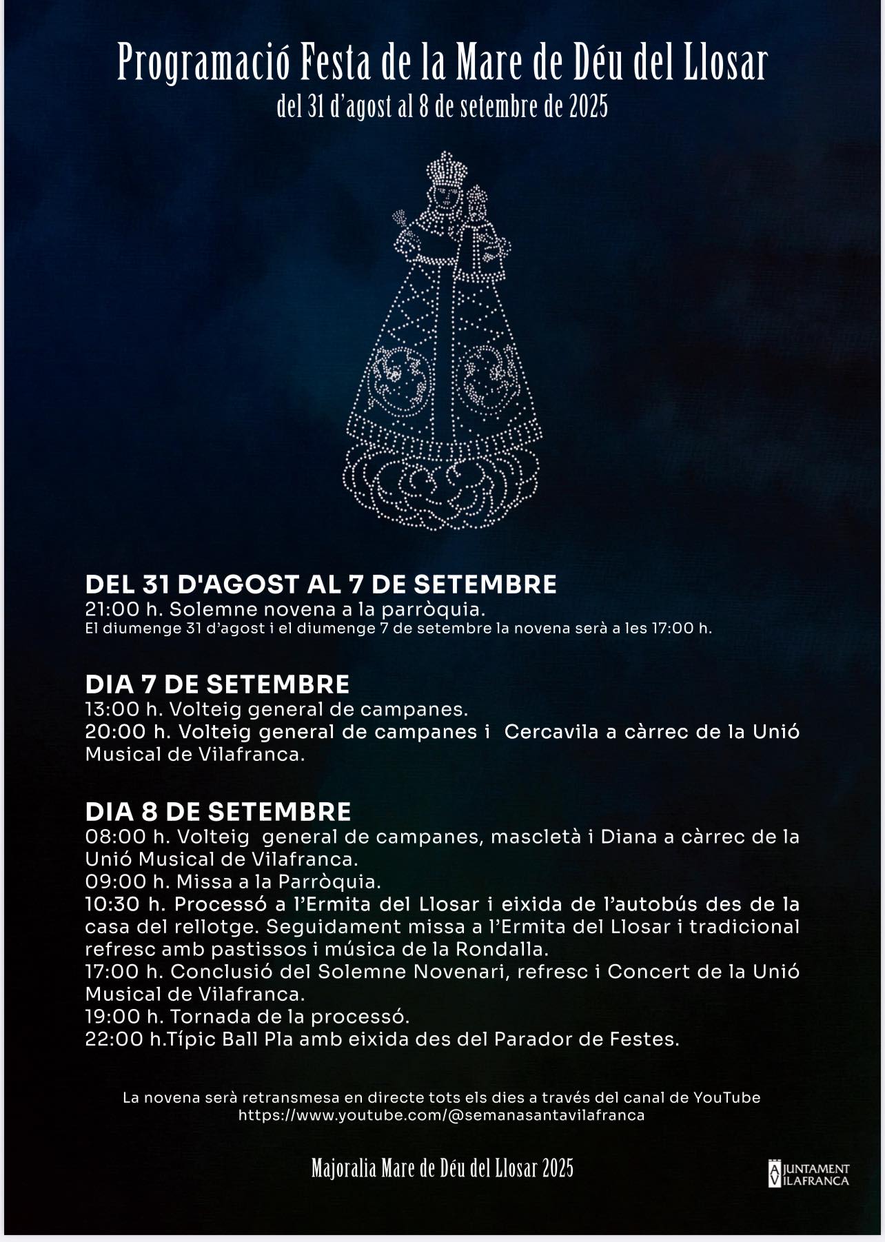 El dilluns dia 8 de setembre, religió i germanor s’uniran perquè vilafranquins, vilafranquines i visitants puguen gaudir al màxim del Dia de la Mare de Déu del Llosar. Les majoralesses d’aquest any han presentat tot un programa on la tradició és la principal protagonista.
