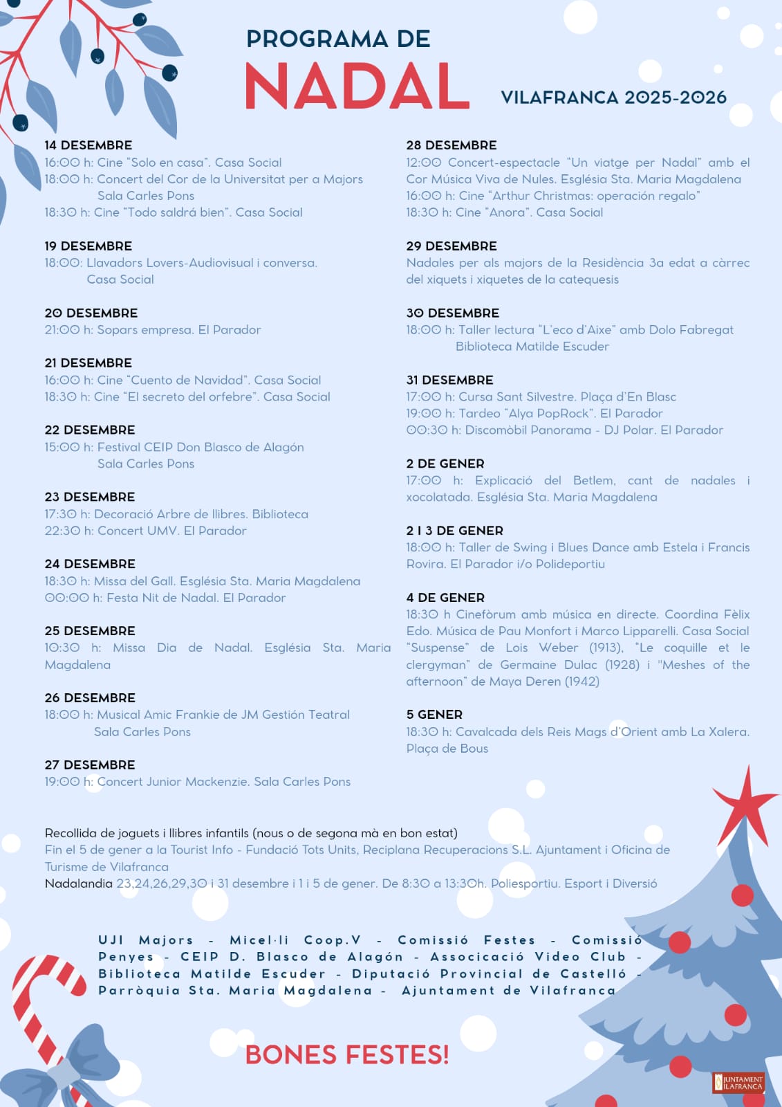 Nadal arriba a Vilafranca amb molta força. Des de l’Ajuntament de Vilafranca s’ha preparat tot un programa d’activitats per a la recta final de desembre i la primera setmana de gener, on grans i menuts podran gaudir al màxim de la màgia de Nadal. Totes aquestes activitats es porten a terme gràcies a diferents associacions i institucions del poble, com l’UJI per a majors, la Comissió de Festes o La Xalera, entre altres.