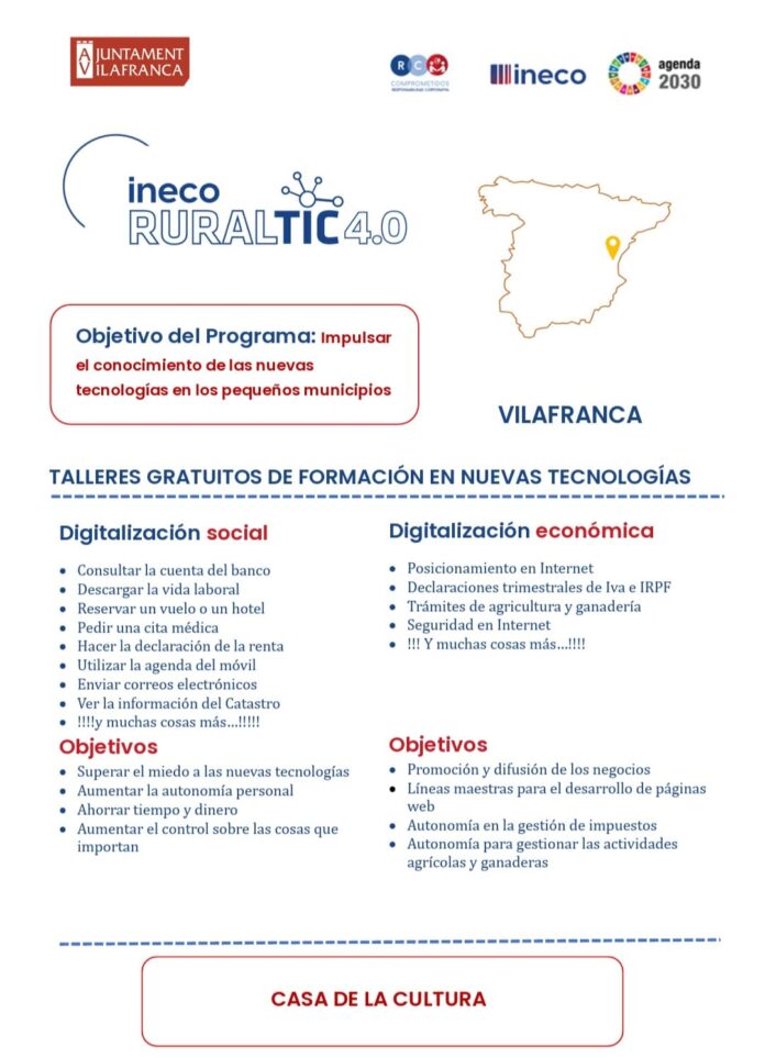 L’Ajuntament de Vilafranca, en col·laboració amb Ineco, posa en marxa al municipi el programa Rural TIC 4.0, una iniciativa de formació gratuïta en noves tecnologies dirigida a tota la ciutadania. Els tallers gratuïts es desenvoluparan del 16 al 27 de febrer a la Casa de la Cultura de Vilafranca, amb sessions pràctiques orientades a la digitalització social.