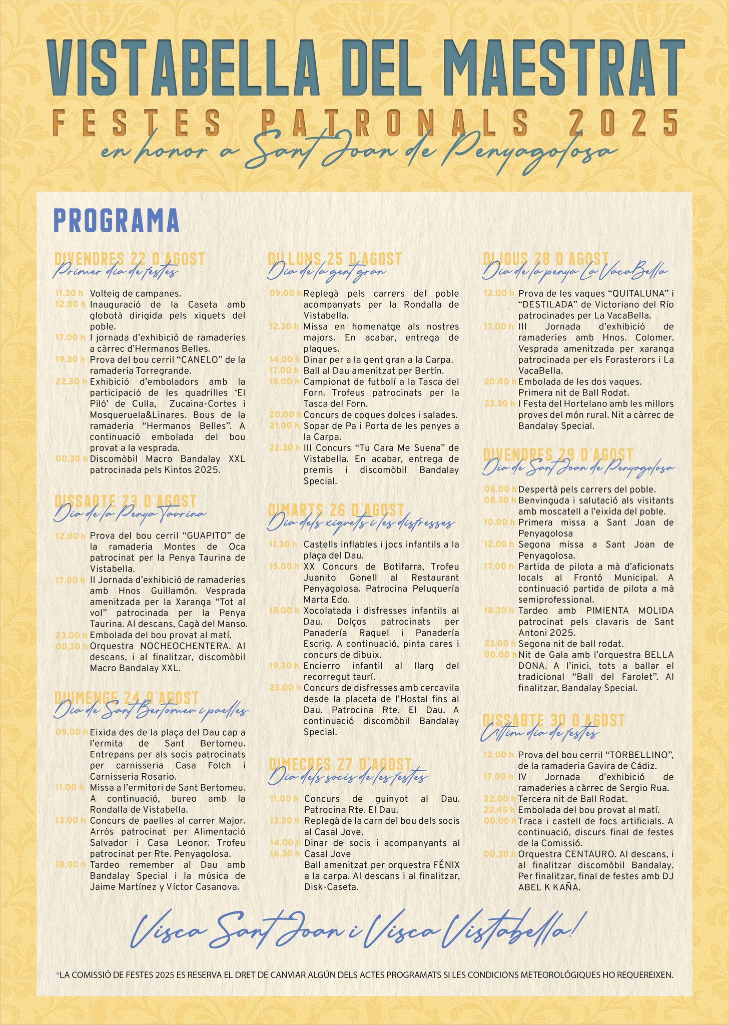 Vistabella del Maestrat viurà del 22 al 30 d’agost les seues festes patronals 2025 en honor a Sant Joan de Penyagolosa i Sant Bertomeu, amb una programació que combina tradició, cultura, música i els actes taurins que marquen la setmana de les festes.